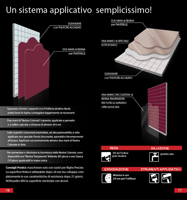 Indicato per locali umidi ove si voglia preservare i supporti, zone di pavimenti e pareti piastrellate. Dona alle superfici trattate una finitura perfetta e duratura, lasciando in evidenza le fughe delle piastrelle, colorandole solamente e non riempiendole.